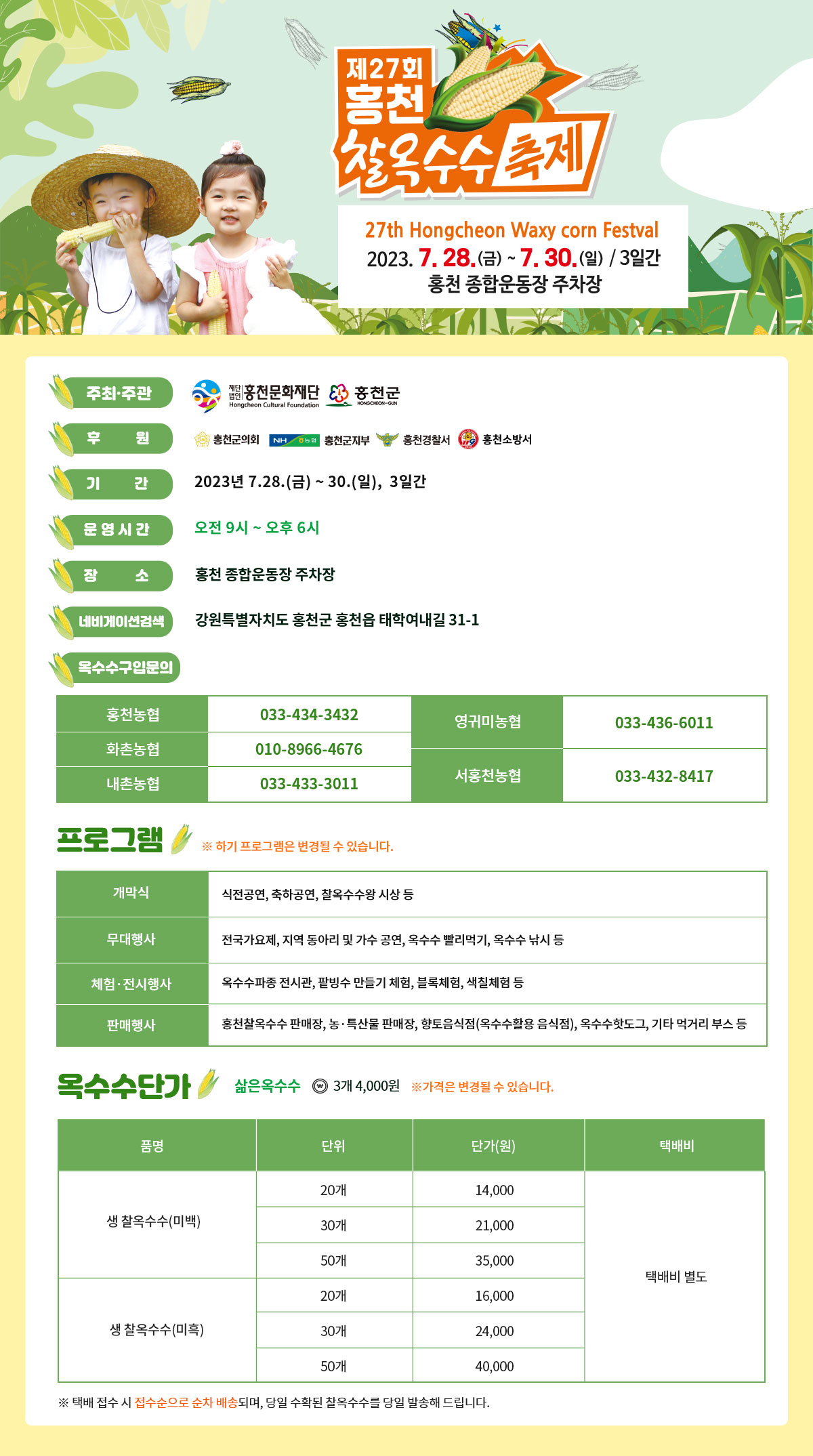 판매행사 : 옥수수판매, 농특산물 판매, 향토음식점 등