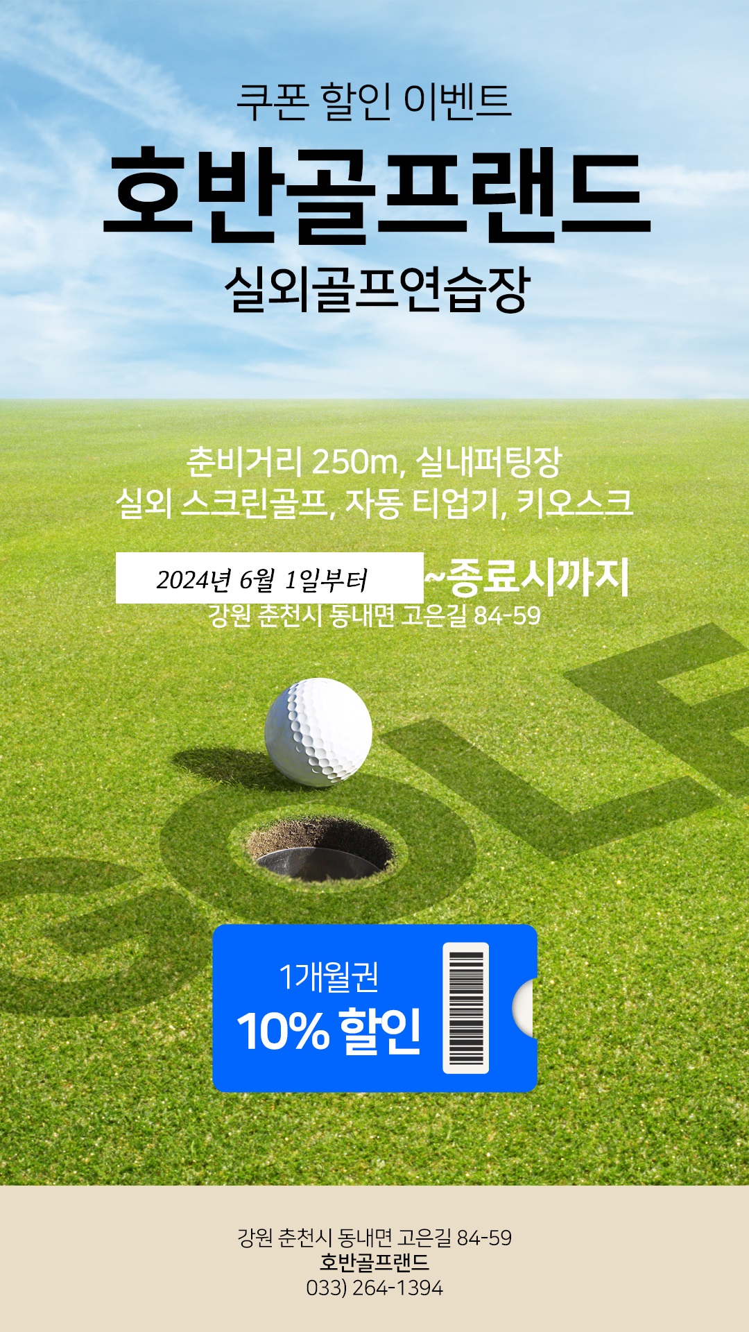 춘천 호반골프랜드 10% 할인 쿠폰을 드립니다.(1개월 기준)