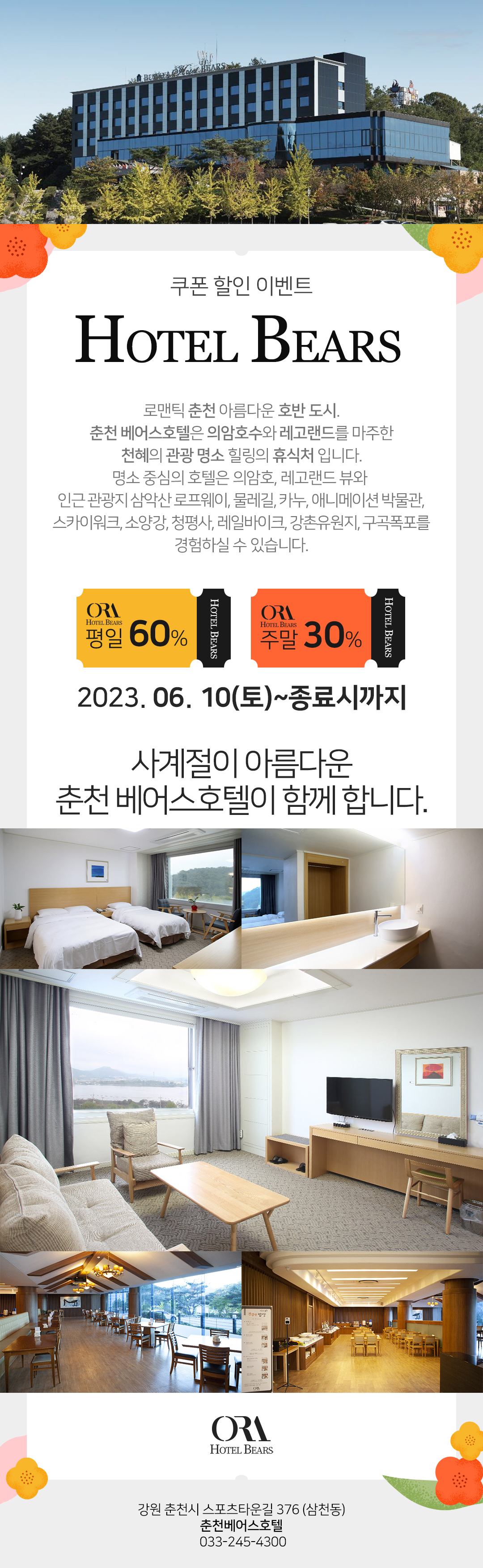 춘천 사계절 아름다운 베어스 호텔에서 방문객 모두에게 할인권을 드립니다.