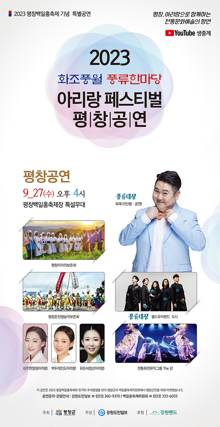 지역문화예술 육성과 평창군민의 문화 향수권 신장의 일환으로 마련한 2023 화조풍월 풍류한마당 아리랑 페스티벌 평창공연이 평창백일홍축제를 맞아 특별 기념공연으로 평창군민께 힐링과 감동의 시간을 선사합니다.
