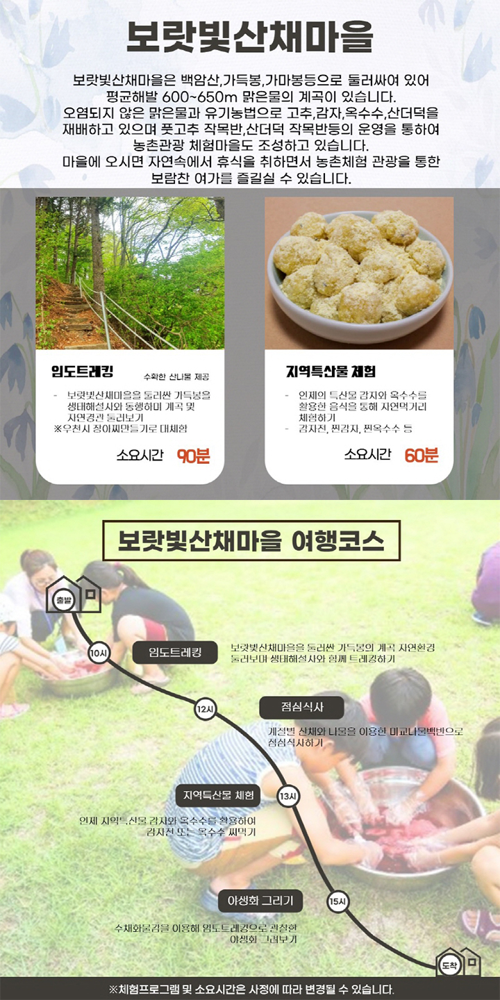 보랏빛산채마을은 백암산, 가득봉, 가마봉등으로 둘러싸여 있어 평균해발 600~650m 맑은물의 계곡이 있습니다.