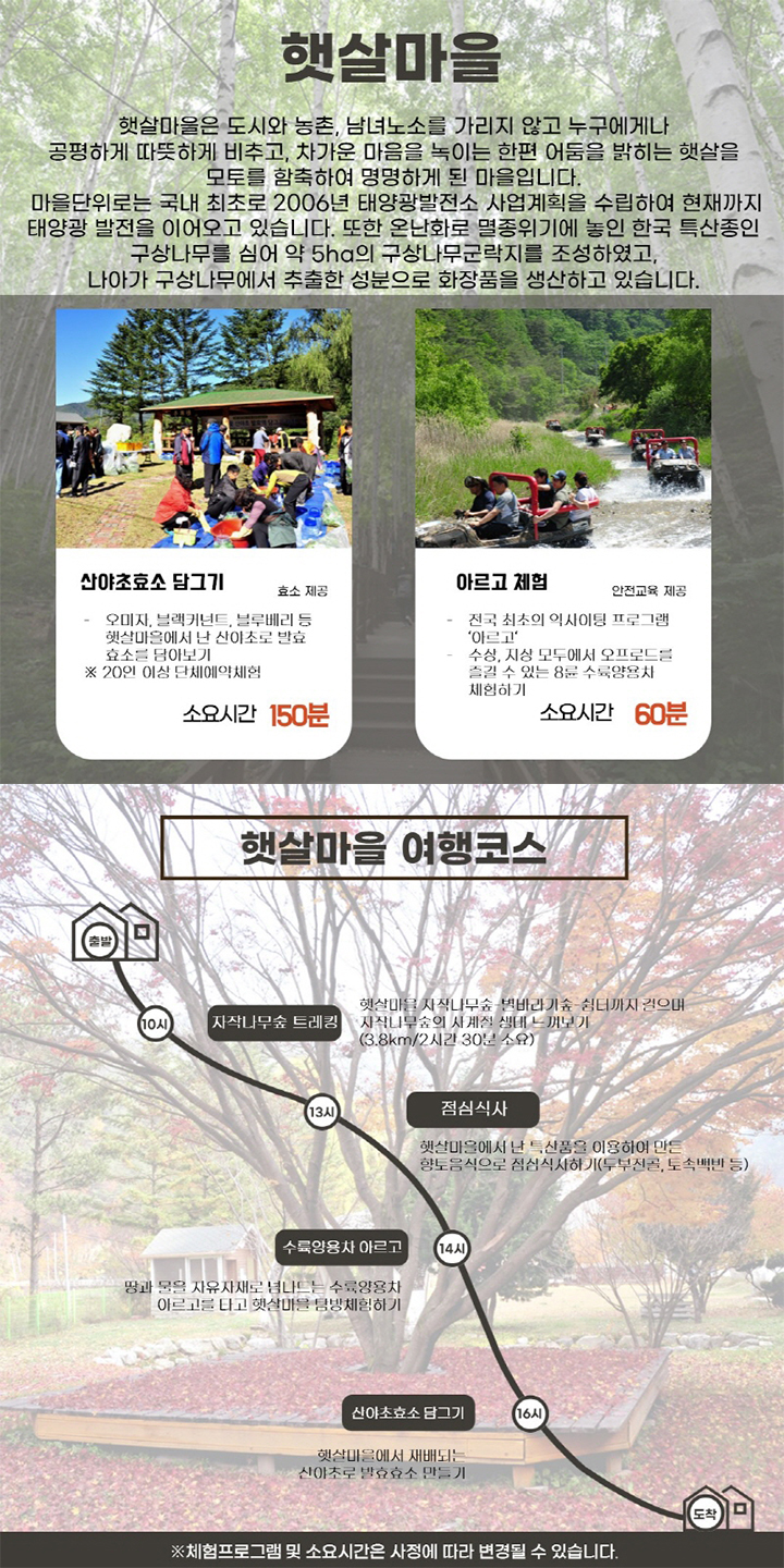 햇살마을은 도시와 농촌, 남녀노소를 가리지 않고 누구에게나 공평하게 따뜻하게 비추고, 차가운 마음을 녹이는 한편 어둠을 밝히는 햇살을 모토를 함축하여 명명하게 된 마을입니다.