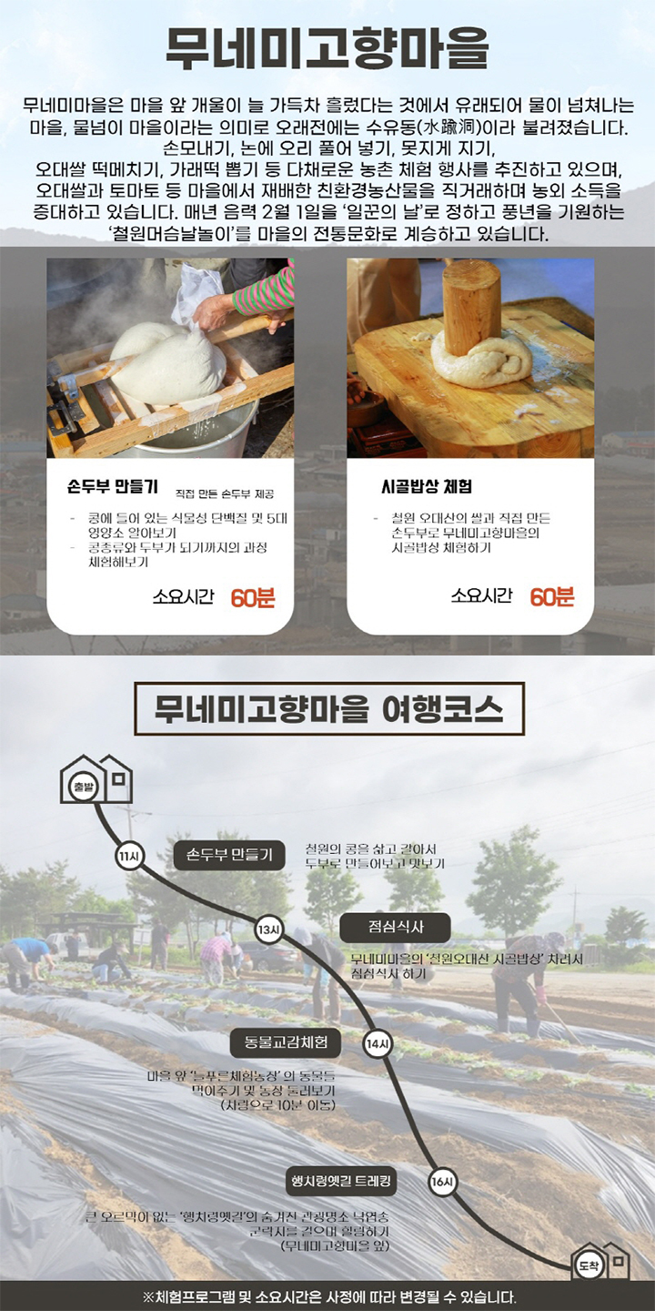 손모내기, 논에 오리 풀어 넣기, 못지게 지기, 오대쌀 떡메치기, 가래떡 뽑기 등 다채로운 농촌 체험 행사를 추진하고 있으며, 오대쌀과 토마토 등 마을에서 재배한 친환경농산물을 직거래하며 놓외 소득을 증대하고 있습니다. 매년 음력 2월 1일은 '일꾼의 날'로 정하고 풍년을 기원하는 '철원머슴날놀이'를 마을의 전통문화로 계승하고 있습니다.