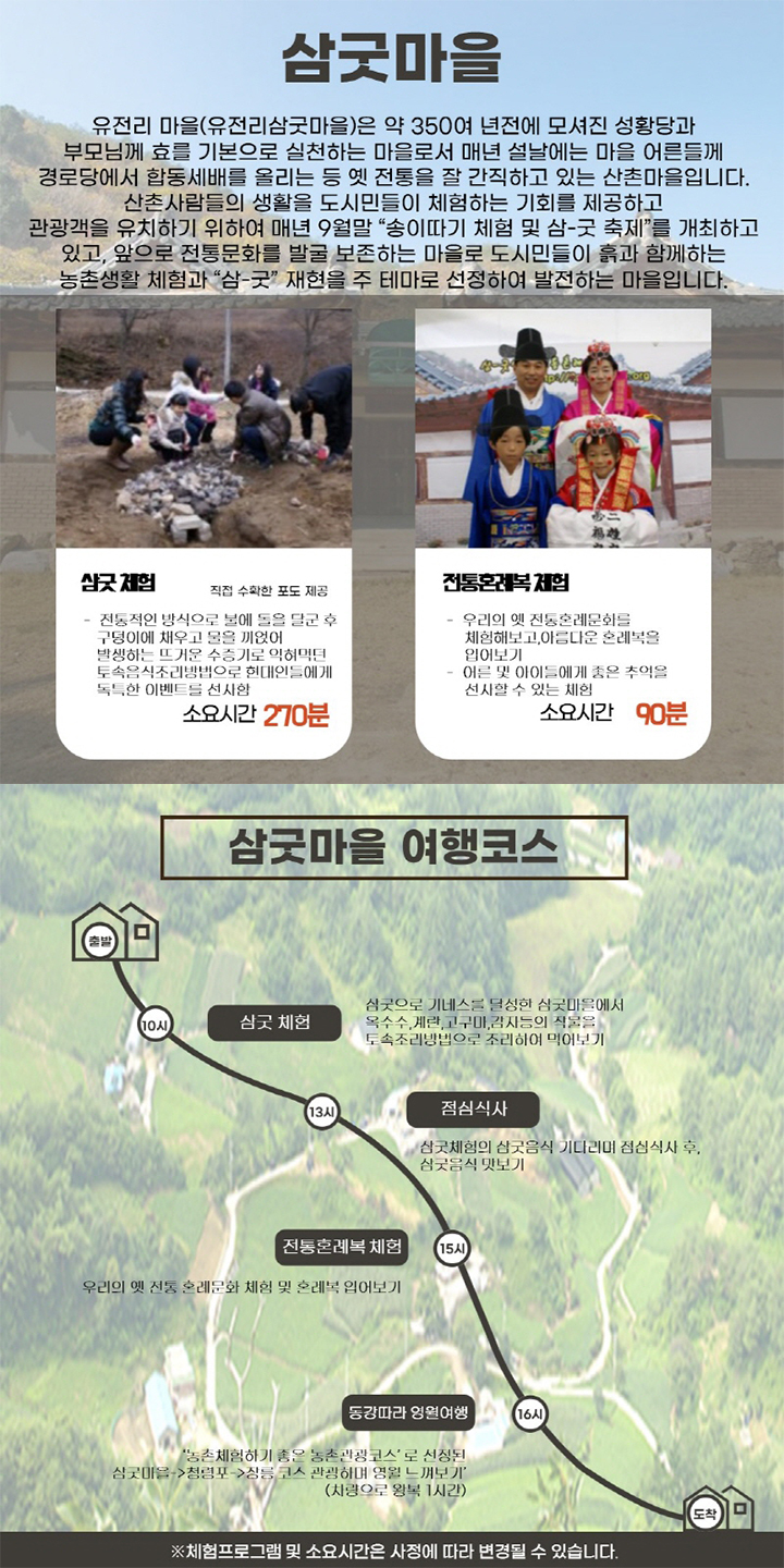 산촌사람들의 생활을 도시민들이 체험하는 기회를 제공하고 관광객을 유ㅜ치하기 위하여 매년 9월말 '송이따기 체험 및 삼굿 축제'를 개최하고 있고, 앞으로 전통문화를 발굴 보존하는 마을로 도시민들이 흙과 함께 하는 농촌 생활 체험과 삼-굿 재현을 주 테마로 선정하여 발전하는 마을입니다.
