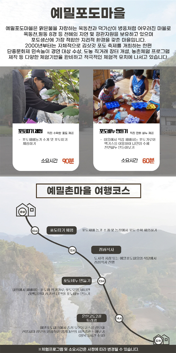 예밀포도마을은 맑은물을 자랑하는 옥동천과 덕가산이 병풍처럼 어우러진 마을로 옥동천, 밀동 8경 등 천혜의 자연 및 광관자원을 보유하고 있으며 포도생산에 가장 적합한 지리적 환경을 갖춘 마을입니다.