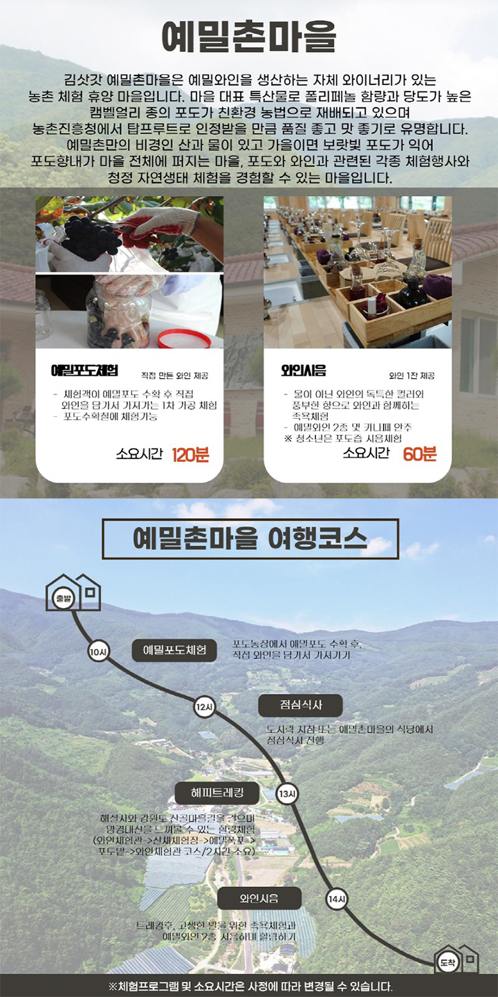 예밀포도마을은 맑은물을 자랑하는 옥동천과 덕가산이 병풍처럼 어우러진 마을로 옥동천, 밀동 8경 등 천혜의 자연 및 광관자원을 보유하고 있으며 포도생산에 가장 적합한 지리적 환경을 갖춘 마을 입니다.