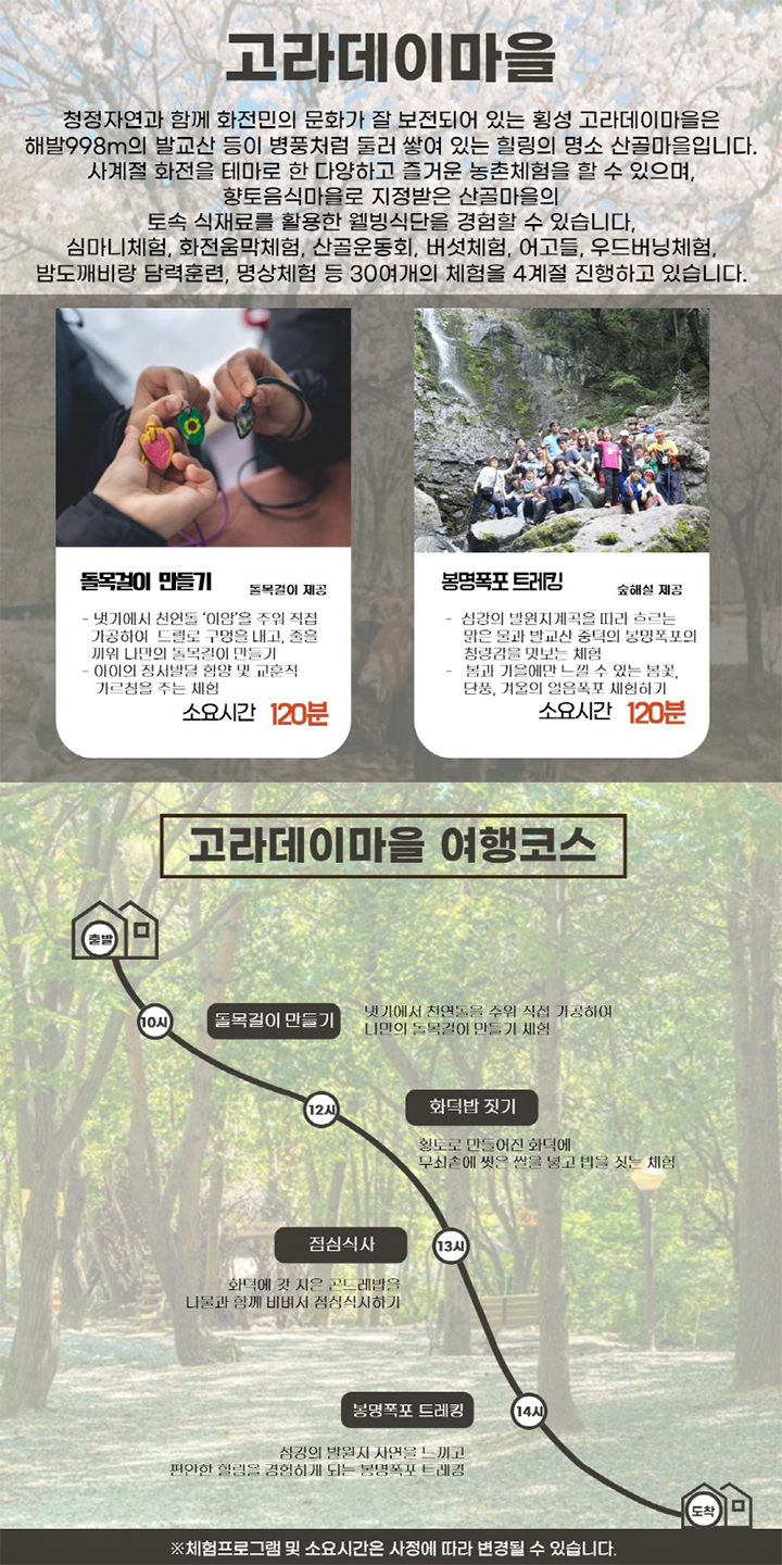 사계절 화전을 테마로 한 다양하고 즐거운 농촌체험을 할 수 있으며, 향토음식마을로 지정받은 산골마을의 토속 식재료를 활용한 웰빙식단을 경험할 수 있습니다.
