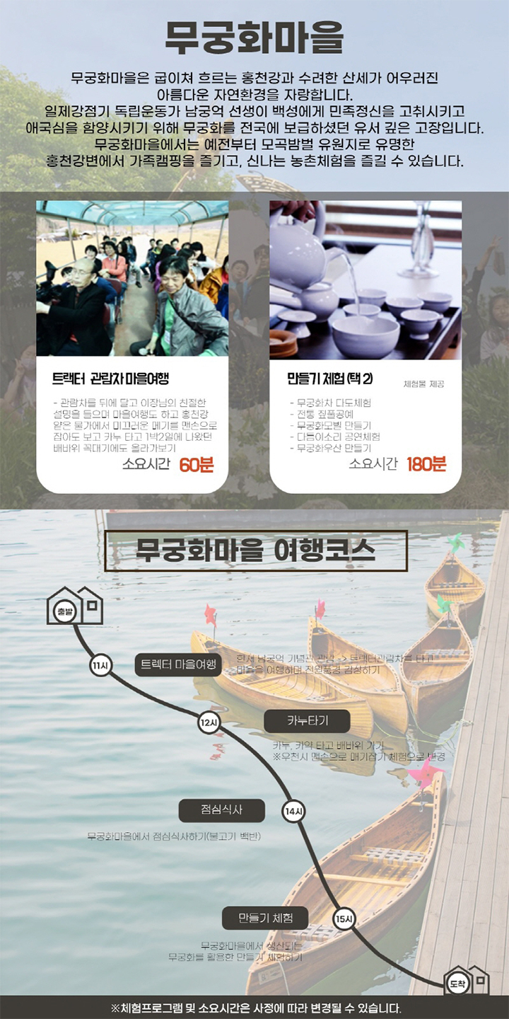 무궁화마을에서는 예전부터 모곡밤벌 유원지로 유명한 홍천강변에서 가족캠핑을 즐기고, 신나는 농촌체험을 즐길 수 있습니다.