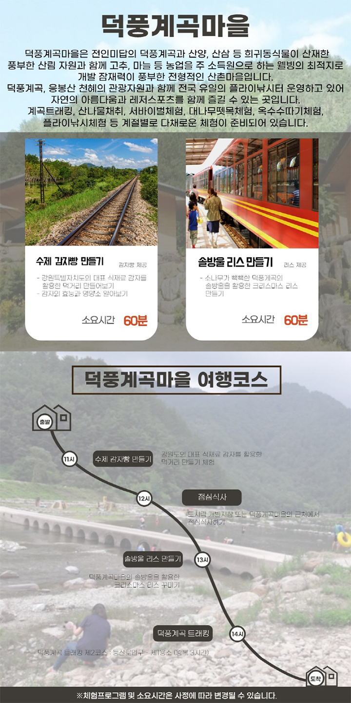 덕풍계곡마을은 전인미답의 덕풍계곡과 산양, 산삼 등 희귀동식물이 산재한 풍부한 산림 자원과 함께 고추, 마늘 등 농업을 주 소득원으로 하는 웰빙의 최적지로 개발 잠재력이 풍부한 전형적인 산촌마을입니다.