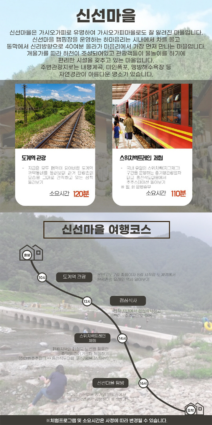 개울가를 따라 하천이 조성되어있고 관광객들이 물놀이를 하기에 편리한 시설을 갖추고 있는 마을입니다.