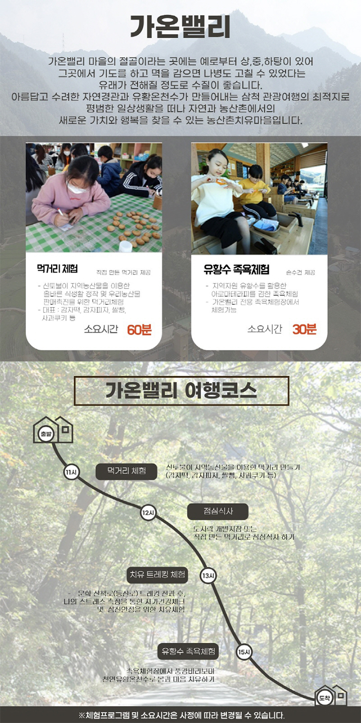 아름답고 수려한 자연경관과 유황온천수가 만들어내는 삼척 관광여행의 최적지로 평범한 일상생활을 떠나 자연과 농산촌에서의 새로운 가치와 행복을 찾을 수 있는 농산촌치유마을입니다.