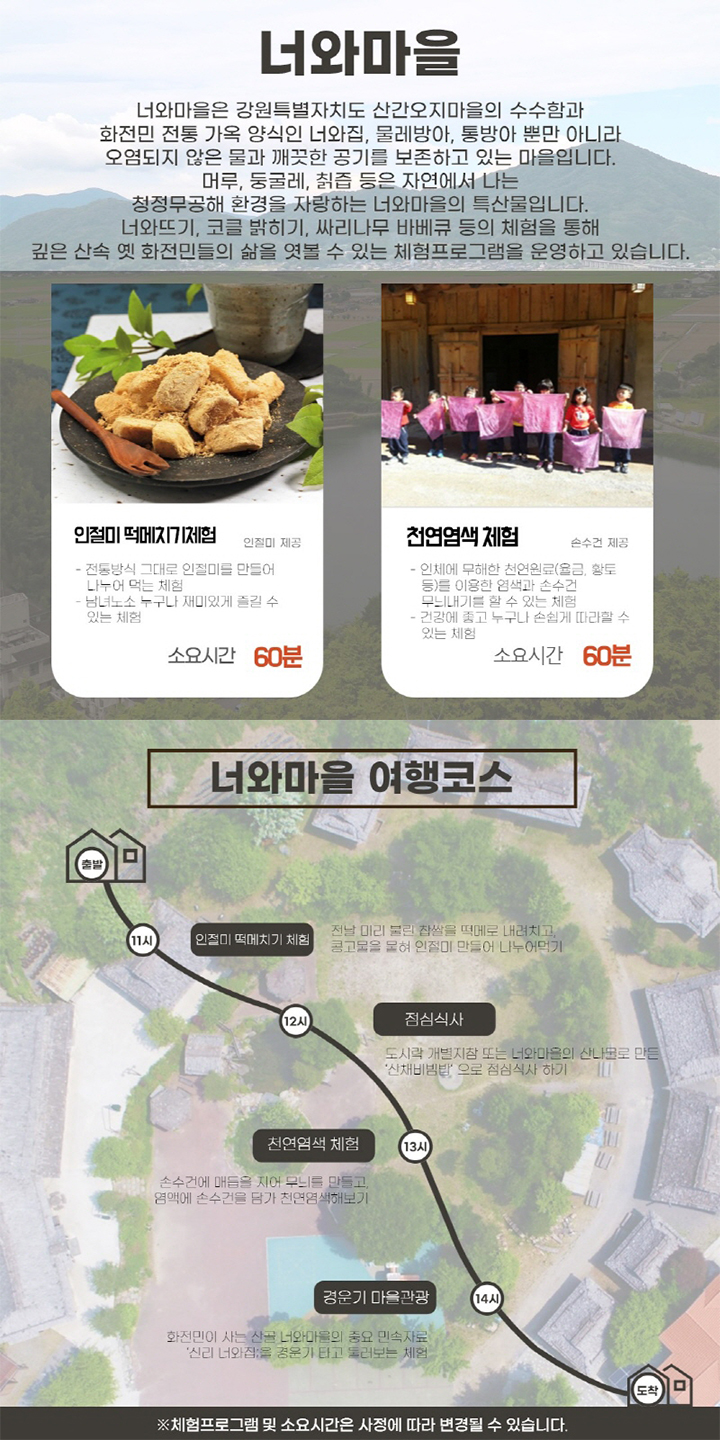 너와마을은 강원특별자치도 산간오지마을의 수수함과 화전민 전통 가옥 양식인 너와집, 물레방아, 통방아 뿐만 아니라 오염되지 않은 물과 깨끗한 공기를 보존하고 있는 마을입니다.