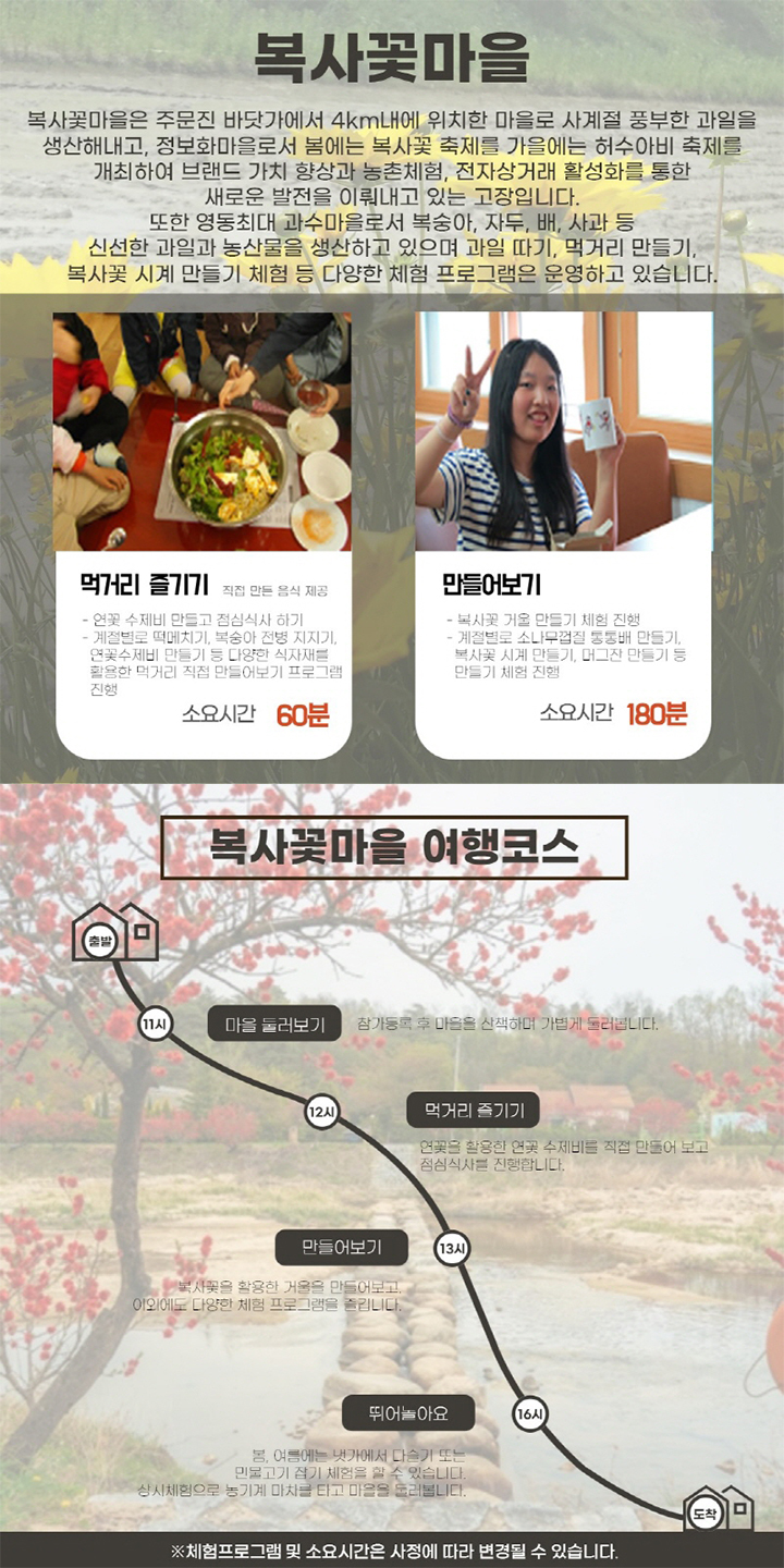 복사꽃마을은 주문진 바닷가에서 4km내에 위치한 마을로 사계절 풍부한 과일을 생산해내고, 정보화마을로서 봄에는 복사꽃 축제를 가을에는 허수아비 축제를 개최하여 브랜드 가치 향상과 농촌체험, 전자상거래 활성화를 통한 새로운 발전을 이뤼내고 있는 고장입니다.