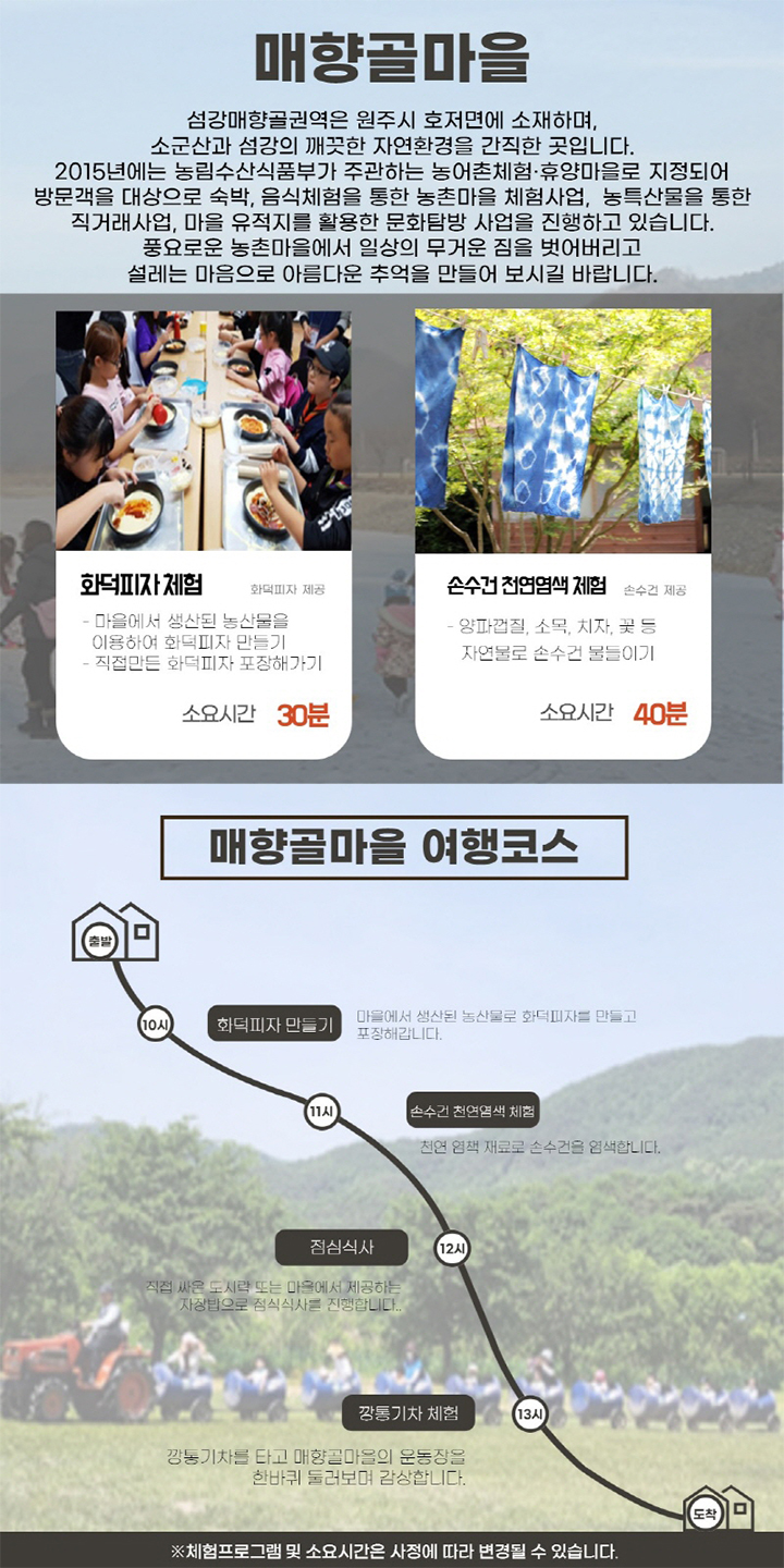 풍요로운 농촌마을에서 일상의 무거운 짐을 벗어버리고 설레는 마음으로 아름다운 추억을 만들어 보시길 바랍니다.