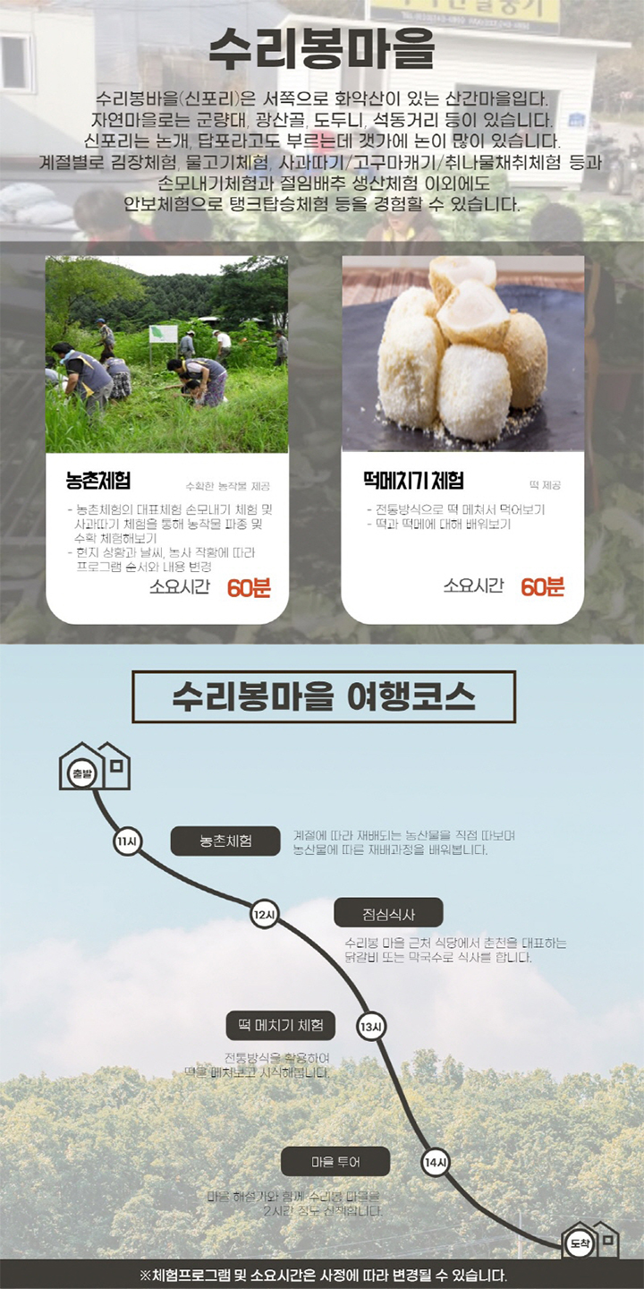 계절별로 김장체험, 물고기체험, 사과따기, 고구마캐기, 취나물채취체험 등과 손모내기체험과 절임배추 생산체험 이외에도 안보체험으로 탱크탑승체험 등을 경험할 수 있습니다.