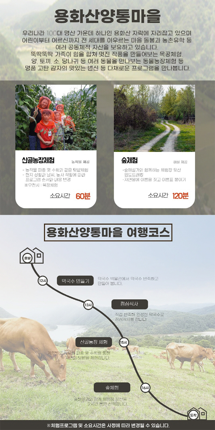 뚝딱뚝딱 가족이 힘을 합쳐 멋진 작품을 만들어보는 목공체험 양, 토끼, 소, 당나귀 등 여러 동물을 만나보는 동물농장체험 등 명품 고탄 감자의 맛있는 변신 등 다채로운 프로그램을 만나봅니다.