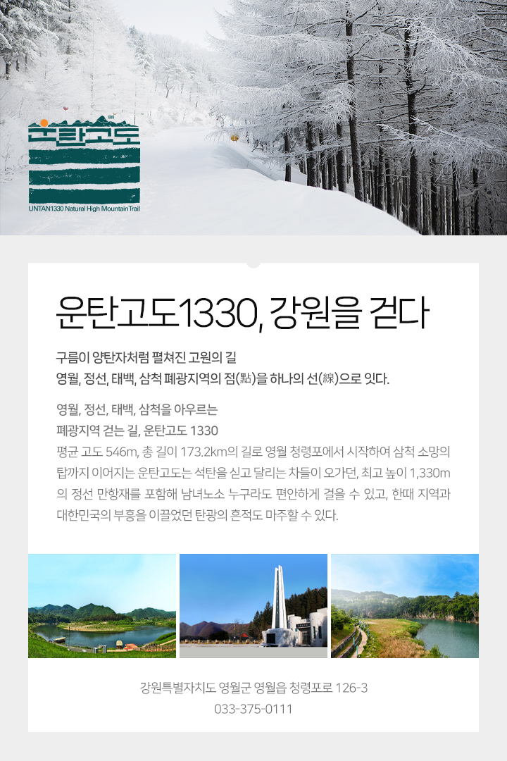 평균 고도 546m, 총 길이 173.2km의 길로 영월 청령포에서 시작하여 삼척 소망의 탑까지 이어지는 운탄고도는 석탄을 싣고 달리는 차들이 오가던, 최고 높이 1,330m의 정선 만항재를 포함해 남녀노소 누구라도 편안하게 걸을 수 있고, 한때 지역과 대한민국의 부흥을 이끌었던 탄광의 흔적도 마주할 수 있다.