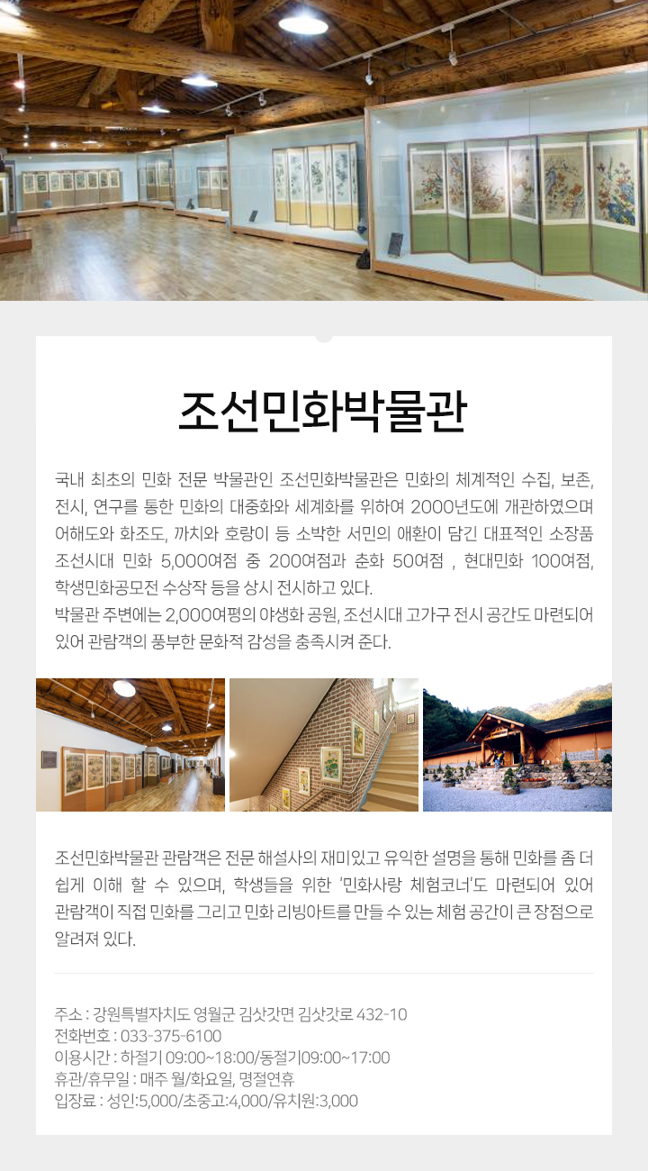 국내 최초의 민화 전문 박물관인 조선민화박물관은 민화의 체계적인 수집, 보존, 전시, 연구를 통한 민화의 대중화와 세계화를 위하여 2000년도에 개관하였으며 어해도와 화조도, 까치와 호랑이 등 소박한 서민의 애환이 담긴 대표적인 소장품 조선시대 민화 5,000여점 중 200여점과 춘화 50여점 , 현대민화 100여점, 학생민화공모전 수상작 등을 상시 전시하고 있다.