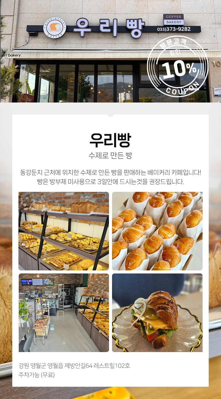 동강둔치 근처에 위치한 수제로 만든 빵을 판매하는 베이커리 카페입니다!