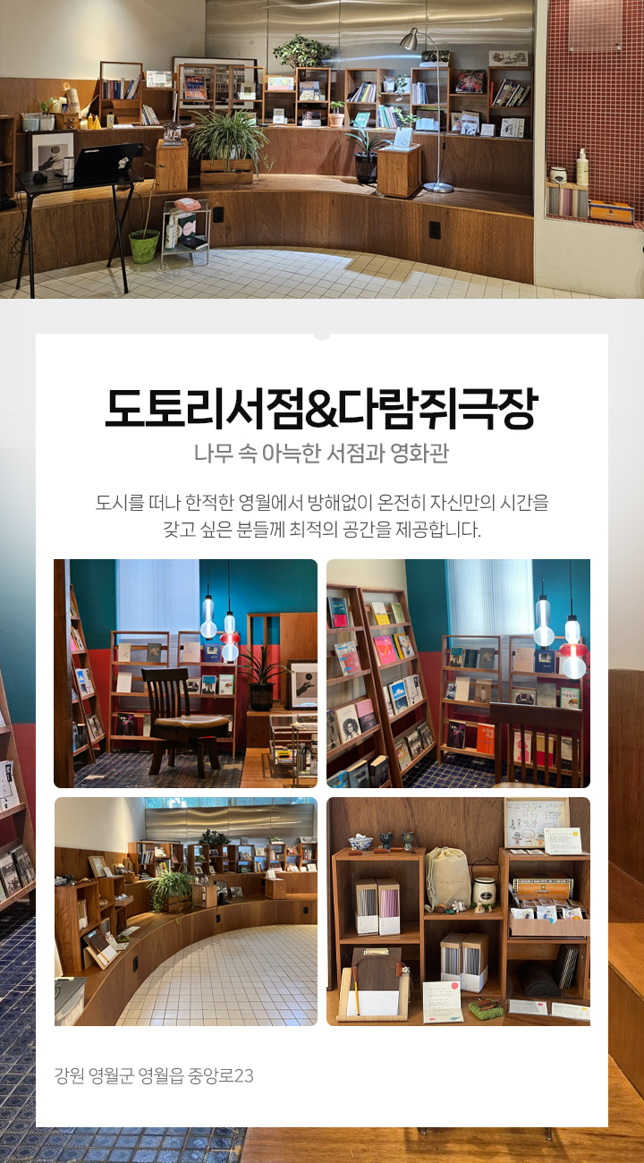 나무 속 아늑한 서점과 영화관 도토리서점과 다람쥐극장에서 매달 새로운 단편영화와 독립 서적들을 만나 볼 수 있습니다. 다람쥐들이 숨겨둔 도토리를 찾아내듯, 다양한 보석같은 작품들과 소품들 그리고 공간이 주는 평온함을 즐겨보세요.