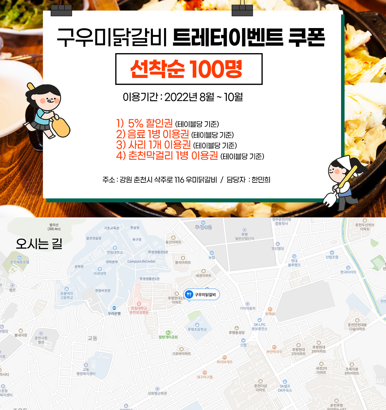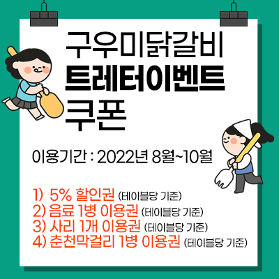 + 쿠폰: 5% 할인권 , 음료 이용권, 사리이용권, 춘천막걸리