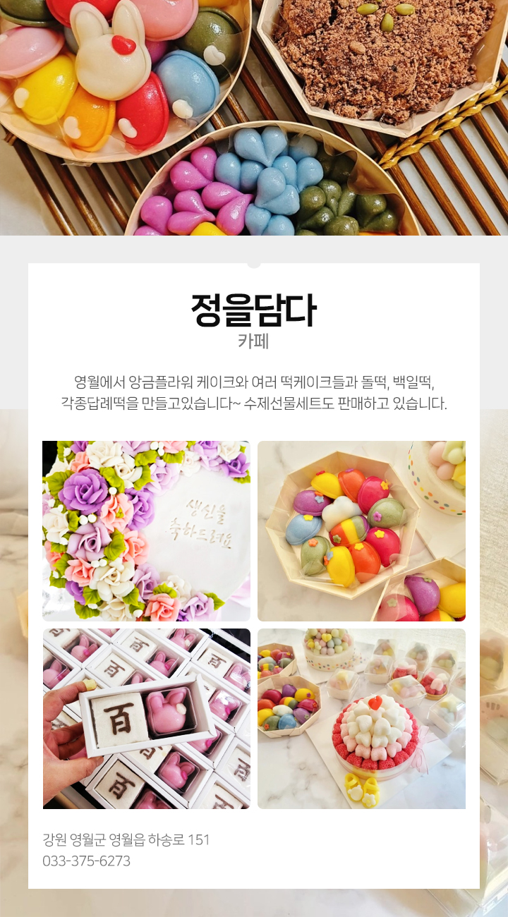 영월에서 앙금플라워 케이크와 여러 떡케이크들과 돌떡, 백일떡, 각종답례떡을 만들고있습니다~ 수제선물세트도 판매하고 있습니다. ^^