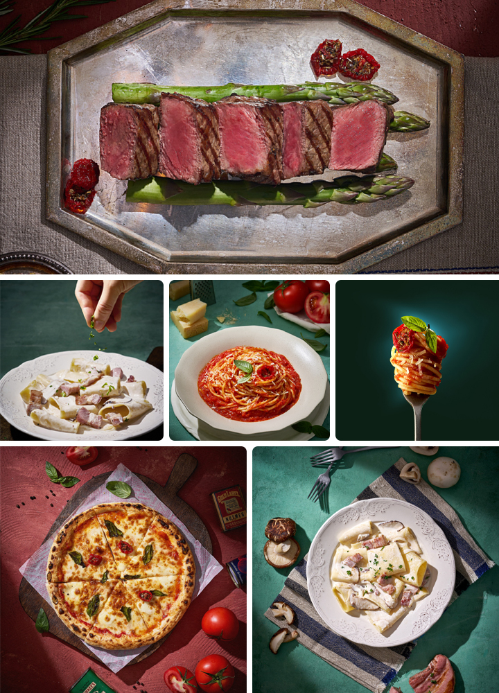 풍부한 재료로 만든 맛있는 파스타와 스테이크