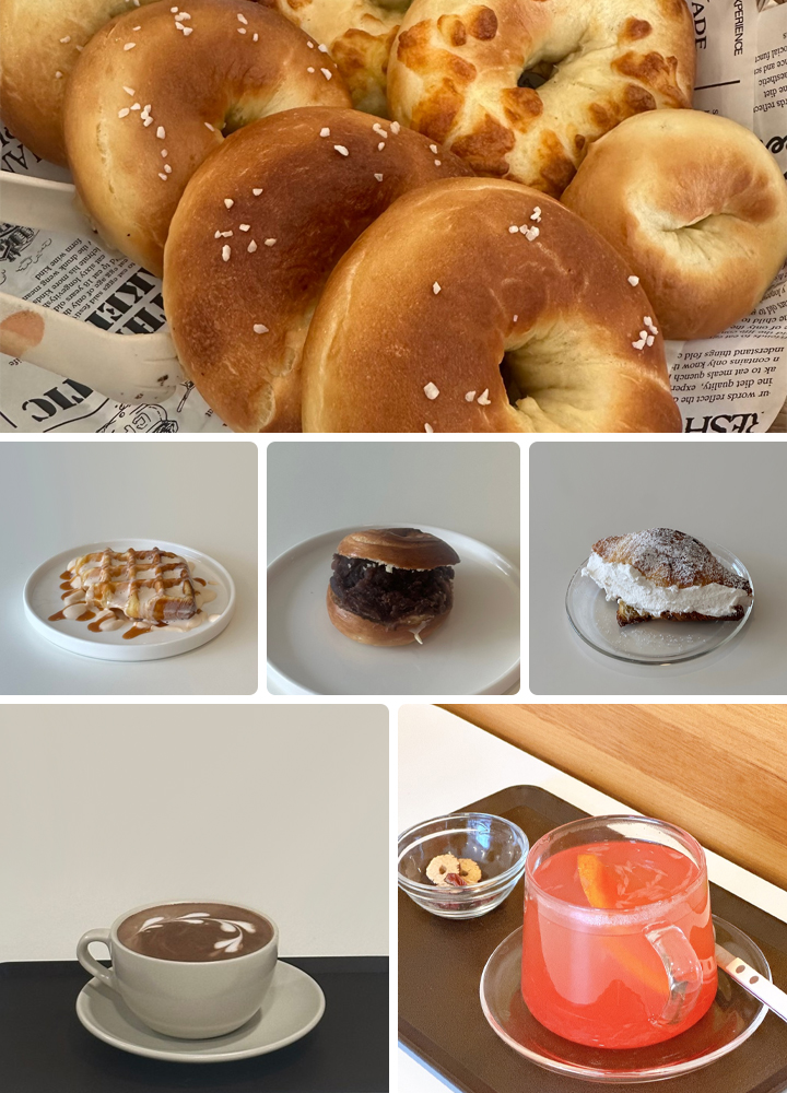 아라비카 다섯가지를 블랜딩한 원두를 사용해 커피의 풍미가 좋고 수제 베이글과 고메버터쿠키 등 맛있는 디저트가 있는 카페입니다:)