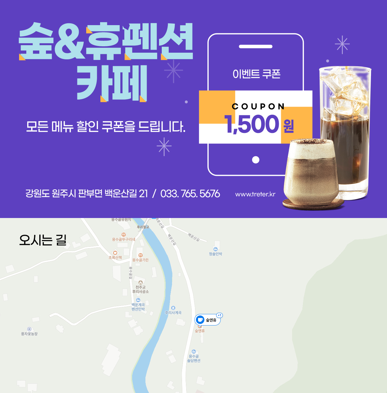 인근 커피, 쌍화차, 샌드위치, 브런치 " 숲&휴펜션 까페" 에서 음료 할인 쿠폰을 드립니다.