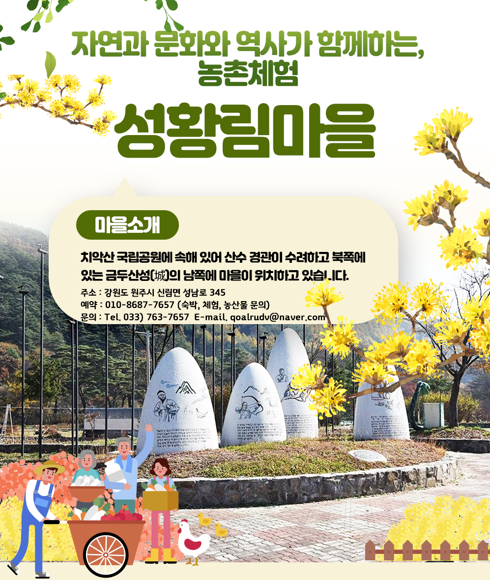 예약 : 010-8687-7657 (숙박, 체험, 농산물 문의)